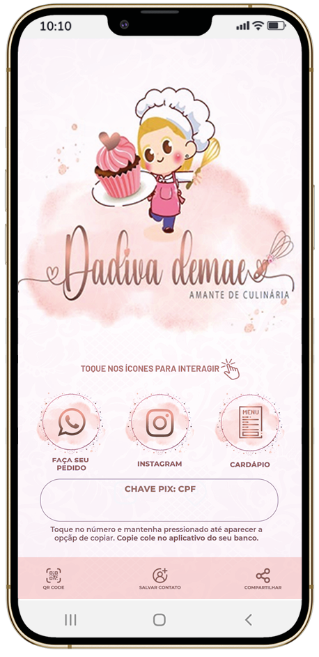 Ele é totalmente personalizado com sua marca e cores. Possui uma segunda página que pode colocar informações sobre sua biografia, produtos ou serviços que oferece, além de disponibilizar a chave PIX com a função de copiar.
